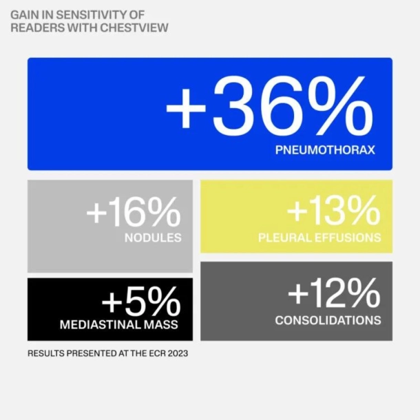 Mais de 70% das radiografias de tórax são consideradas normais. O ChestView acelera a priorização com um design exclusivo que combina descobertas vitais e alta sensibilidade, auxiliando na triagem dos pacientes.