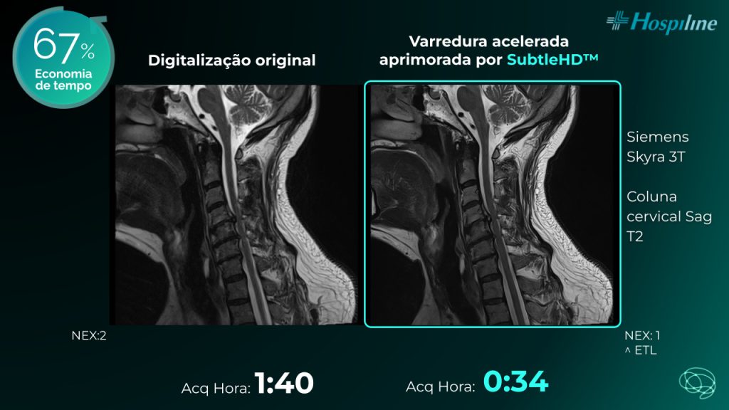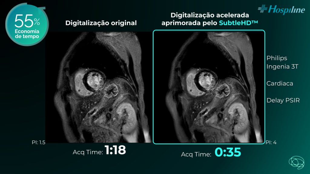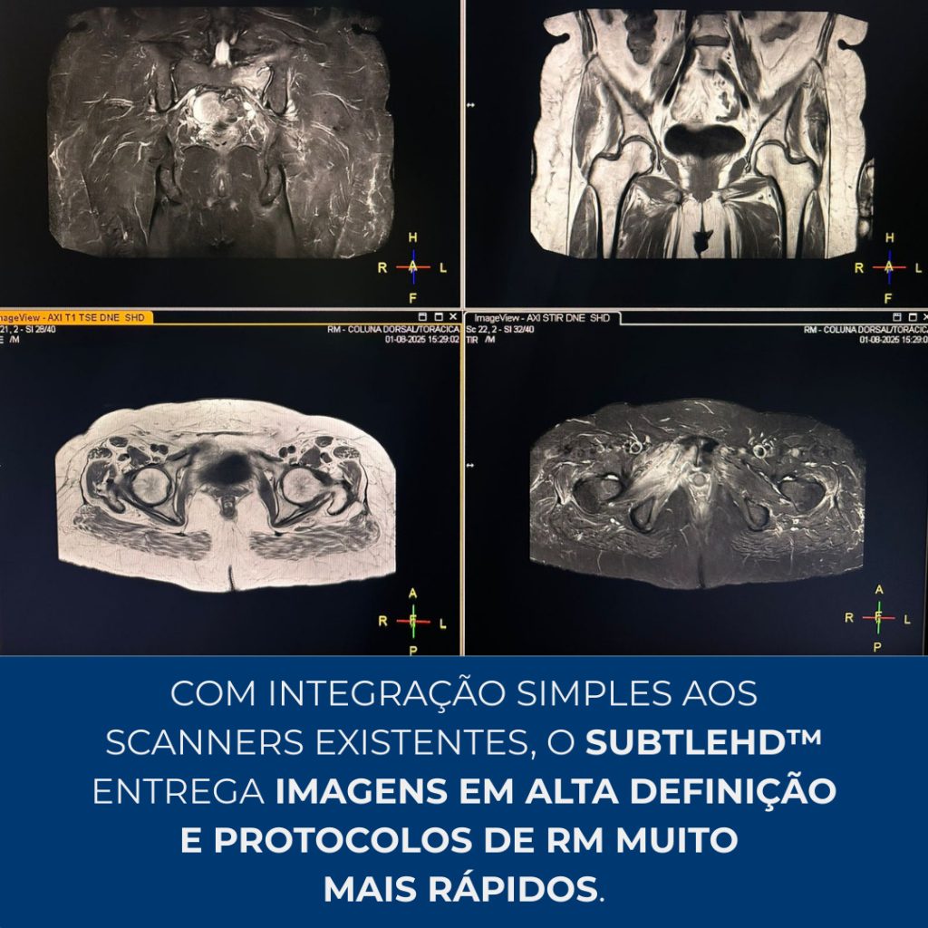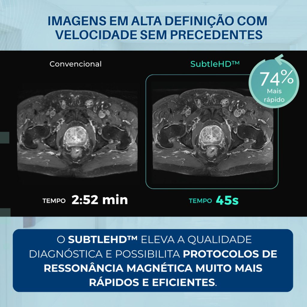 O SubtleHD™ é uma solução de software de ponta, baseada em Inteligência Artificial com tecnologia deep learning, que melhora drasticamente a qualidade das imagens e possibilita protocolos de Ressonância Magnética hiperacelerados. Com determinadas sequências alcançando até 80% de redução no tempo de exame, o SubtleHD™ estabelece um novo patamar, superando outras soluções de IA disponíveis no mercado e oferecendo aos radiologistas a capacidade de otimizar a eficiência sem comprometer a confiança diagnóstica.